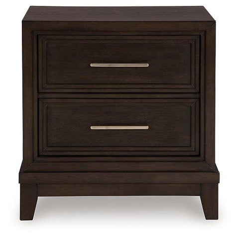 This nightstand combines modern and art deco styles for both traditional and contemporary arrangements. With elegant stepped moulded framing and two spacious drawers, it adds dimension to your sanctuary while keeping your belongings organized and clutter-free. Indulge in a fresh look that feels right at home.