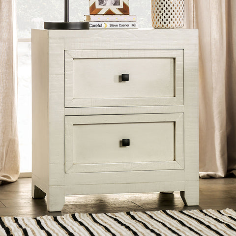 Simple but bold in stature, this inspired night stand is the epitome of farmhouse appeal. Each panel is hand-painted using non toxic water-based paint, and then rubbed off meticulously by hand for a beautiful distressed look. The construction is top-notch as well, as seen in the English dovetail drawers and heavy duty hinges. The black square knobs are a nice final touch. All these details come together for a solid wood night stand that's stylish and timeless.