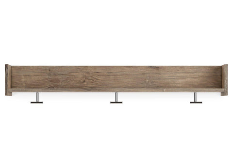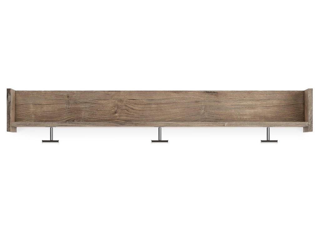 This stylish and versatile wall-mounted coat rack is an ideal addition to your entryway or mudroom. It features an open shelf for easy access or display. A dry, light finish with replicated oak grain is accented with three brushed nickel-tone hooks for hats and handbags. Wall mounting bracket included.