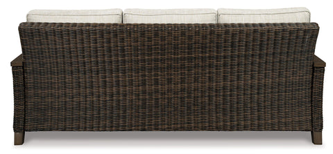 Pretty enough for trendy interiors, yet durable enough to weather the elements, the Paradise Trail outdoor sofa rises to the challenge beautifully. Handwoven resin wicker over rust-proof aluminum merges high style with low maintenance. Rest assured, though the exposed armrests and feet look remarkably like wood, their sturdy aluminum construction is perfectly suited for alfresco living. Plush seat cushions and throw pillows wrapped in high-performing NuvellaĀ® fabric aim to please.
