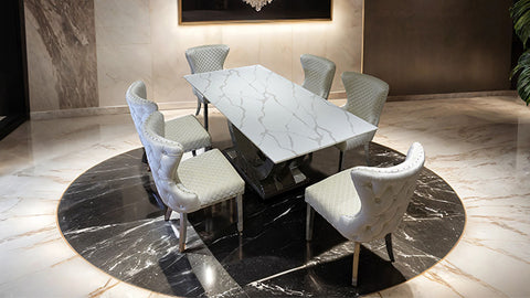 Table + 6 Chairs, Glam, Chrome, Fabric, Sintered Stone, Stainless Steel, Horseshoe-Shaped Pedestal Base Design, Diamond Pattern Upholstered Chairs w/ Nailhead Trim, Square Legs