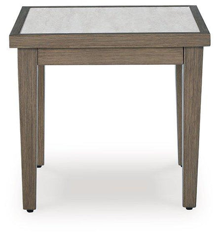 Experience the perfect combination of durability and style with this outdoor end table. An aluminum frame with a wood-look finish maintains a sleek, contemporary aesthetic, while the sintered stone tabletop adds an element of natural elegance. This delightful companion to your outdoor seating creates an oasis where comfort and beauty thrive.