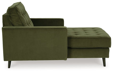 This chaise strikes the perfect balance between elevated and eclectic. Contemporary lines and a richly hued velvet upholstery keep things chic. Design details like button tufting and splay legs add mod flair. It’s sure to keep your living room luxuriously on trend—at a price that won’t break the bank.