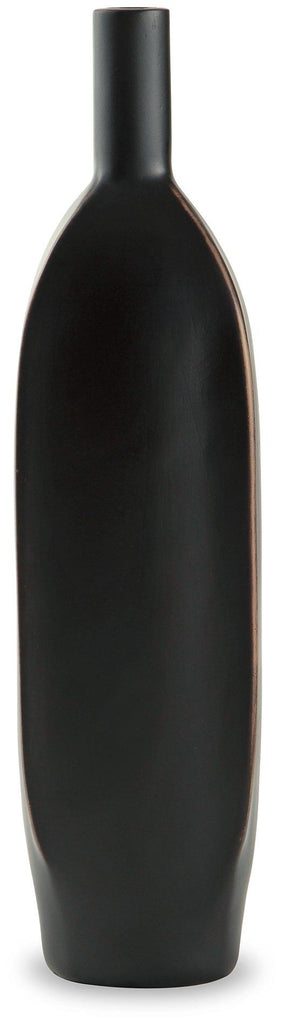 Impress with the simply sleek stylings of this vase. A black finish coats the piece, with a brown rub on the corners acting as a subtly eye-catching design element. What a chic addition to your bookcase, mantel or tabletop.