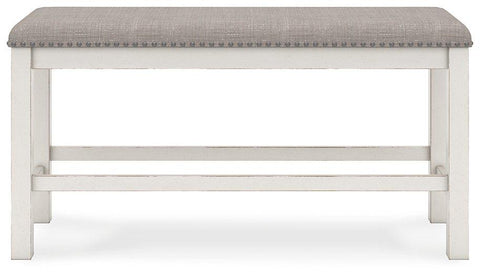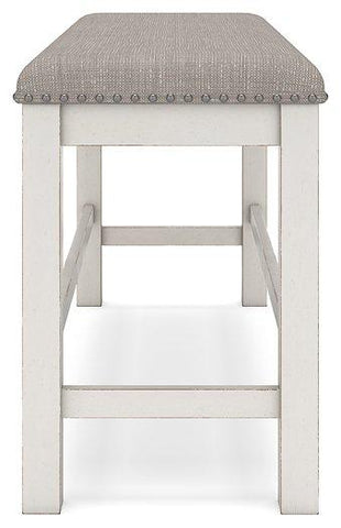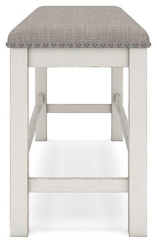 This counter height dining bench is sure to impress come mealtime. With its white finish and light gray upholstery, farmhouse-style seating has never been so fashionable. All that’s missing is you and your family.