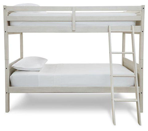 This twin/twin bunk bed with ladder is made with wood, select oak veneer, engineered wood and cast resin components. Pairs with other items in the series to make a bed kit.
