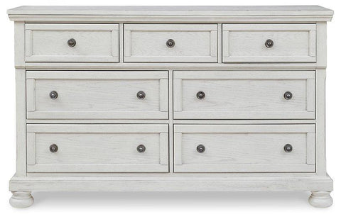 Elegant, timeless furnishings take your bedroom to the next level. Nothing does that better than this dresser. The antiqued white finish with a wonderful grain texture radiates sophistication, while the dark bronze-tone hardware adds an ornate touch. A hidden pull-out tray behind the top middle drawer puts your small valuables out of sight. Felt-finished top drawers round out the piece for the ultimate tasteful bedroom.