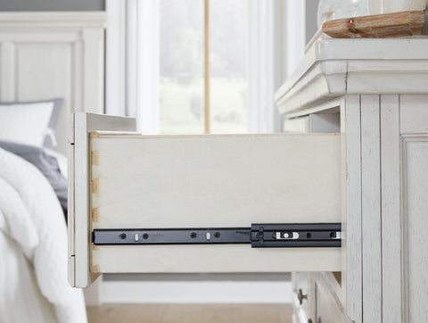 Elegant, timeless furnishings take your bedroom to the next level. Nothing does that better than this nightstand. The antiqued white finish with a wonderful grain texture radiates sophistication, while the dark bronze-tone hardware adds an ornate touch. A hidden pull-out tray behind the bottom drawer puts your small valuables out of sight. Felt finishing in the top drawer and a hidden pull-out tray rounds out the piece for the ultimate tasteful bedroom.