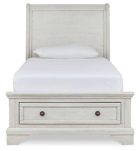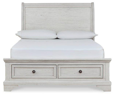 Elegant, timeless furnishings take your bedroom to the next level. Nothing does that better than this full sleigh bed with storage footboard. The antiqued white finish with a wonderful grain texture radiates sophistication, while drawers with dark bronze-tone knobs add a sophisticated touch. Rounding things out, the subtle curve of the headboard keeps the look polished and poised.