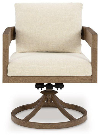 Elevate the appeal of easy-breezy living with this outdoor swivel dining chair. Made to look like wood yet durable enough to weather the elements, it's sure to serve you and your besties well, year after year. The gently curved chair features cushions wrapped in Nuvella+™ high-performance fabric for plush refinement. Go ahead and take a spin.