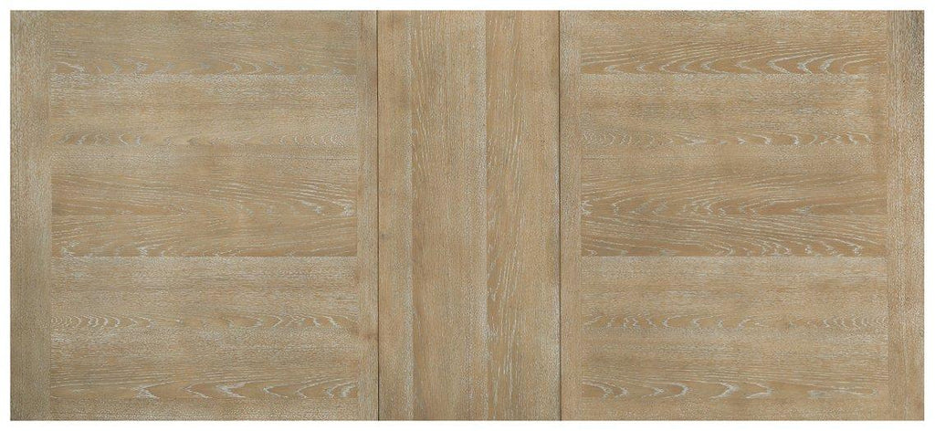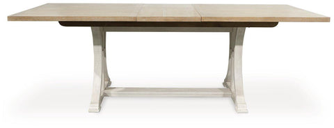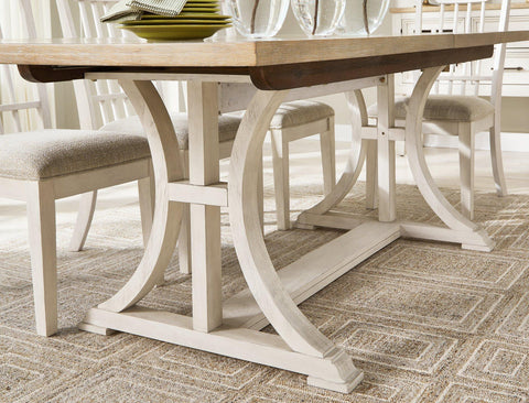This extension dining table elevates the art of modern farmhouse design. Its charming two-tone aesthetic blends antiqued white and light grayish brown finishes for a feeling of relaxed comfort, while the stylish double trestle base adds a distinctive touch. An extension leaf means there's always room for more guests. Now your only worry is what to serve for dinner.