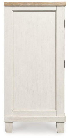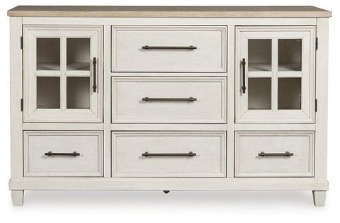 This dresser elevates the art of modern farmhouse design. Its two-tone aesthetic blends antiqued white and light grayish brown for a charming finish. Framed drawer fronts and windowpane cabinets lend a country feel. Conveying a feeling of relaxed comfort, the dresser is sure to carry you away to a dreamy time and place.