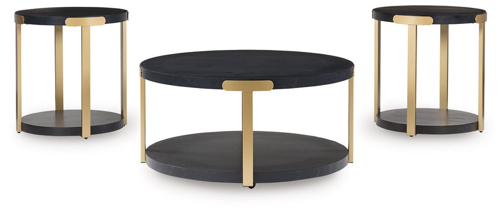 Reflect your cool, contemporary eye for design with this table set. Pairing a gleaming goldtone finish and black wood grain pattern, it crafts a luxe look for your living room. The lower shelves are well-suited for displaying your favorite decor, while casters on the coffee table offer added flexibility.