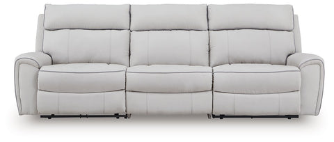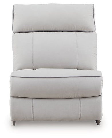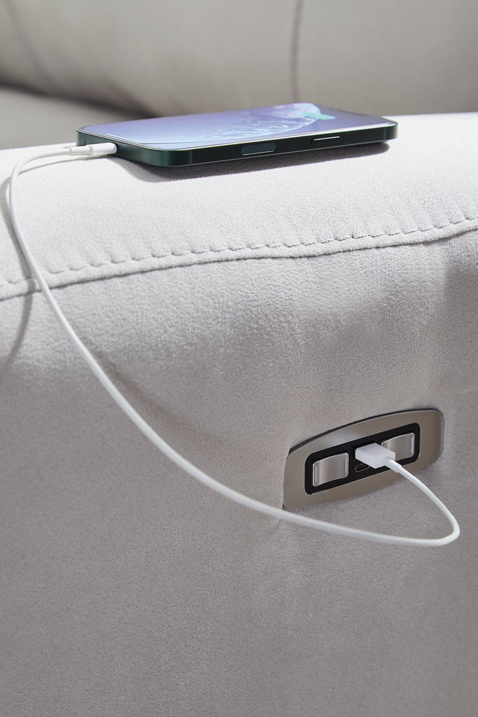 Smart, clean and ultra modern, this power reclining sectional is utterly in vogue. You'll love its indulgent cushions and contemporary bustle back styling. The sumptuous fabric, accentuated with contrasting welting, easily blends with your decor. A convenient console with storage and two cup holders keeps essentials handy. And with reclining at the press of a button, this modular sectional proves chic design and superb comfort go hand in hand.