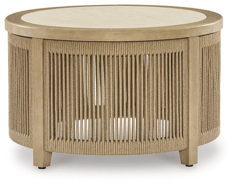 Kick back and relax with the contemporary vibe of this outdoor coffee table. Its rope detailing brings artistic flair, while the naturally beautiful eucalyptus wood provides must-have durability. And for added style and function, a cleanable stone-look tabletop completes the piece.