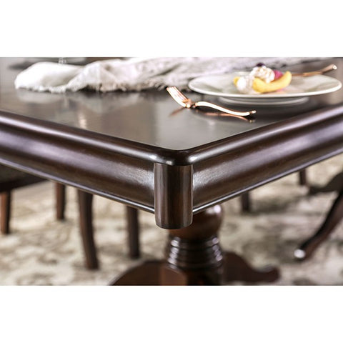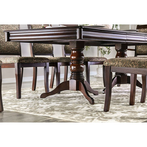 Your family will enjoy dining on this transitional set, which features a double pedestal table fits up to six. Chairs are comfortable with upholstered seats and backs and simple elegant lines. A matching buffet provides generous storage. Round table is also available.