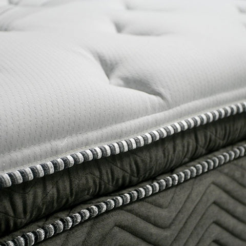 STORMIN White/Gray 13" Euro Pillow Top Mattress, E.King, 80"L X 76"W X 13"H, 90lbs. 13" Euro pillow top with gel infused memory foam with foam encase edge support system. Available in Full, Queen, Cal.King, and E.King sizes. Features: Quilting: 5 Layer tack & jump quilting HD polyurethane Foam Safety: Hanes Stratus FR Cover Edge Support: 360 Foam encase edge support system 3.5" of 4 sides edge casing Lumber Support: Individual Pocket Coils Innerspring: Foam Encased Individual Wrapped High Profile Pocket Coil With 6 Gauge Border Wire Foam: Premium Foam: 1" Gel Infused Visco Memory Foam. multi layer HD polyurethane Padding: Foam innerspring support base Stitching: Deluxe Grey 1 1/2" Tape With TEX60 Yellow Kevlar Thread Coil Counts: Twin:450 Full:660 Queen: 800 EK and CK: 992 (coil counts based on full perimeter) Comfort: Luxury Plush