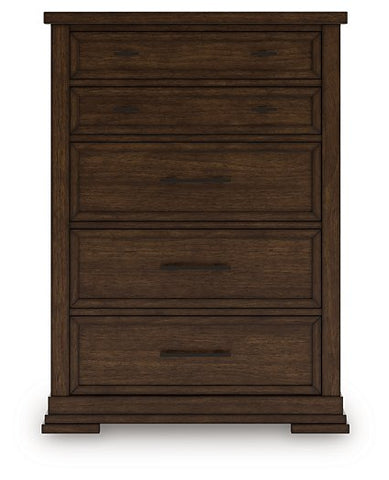 Style, simplicity and charm are hallmarks of this chest of drawers. Created with casual spaces in mind, it has the versatility to suit styles from craftsman to modern farmhouse. The rich brown finish aligns with your refined-meets-relaxed approach to everyday style. And for a timeless touch, five drawers with picture frame detailing accommodate your needs.