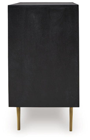 Style? Tons. Storage? Check. This accent cabinet adds more than just a contemporary cool design to your space. Finished in black and goldtone with a carved pattern on the door fronts, it conveys a sophisticated style that's perfect for a bar area. Push magnet doors open to reveal a shelf. After a long day of adulting, let this piece help you mix up a little reward.