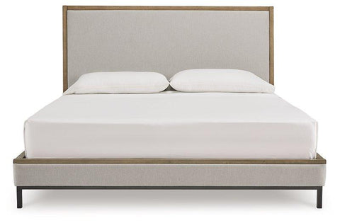 Sleek in its simplicity, this king upholstered bed takes a relaxed approach to refinement. The mixed-material design brings a trendy urban-chic feel to bedtime, while its functional features add convenience. A cushioned lay-back headboard makes reading or watching TV in bed all the more comfortable. And with sturdy roll slats included, your mattress is supported without the additional expense of a foundation or box spring.