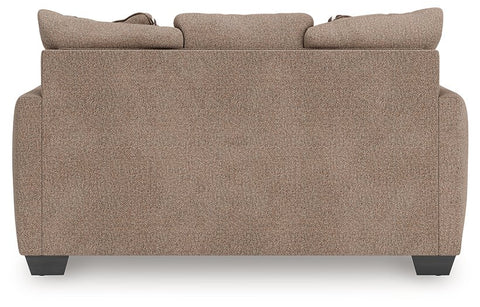 Transitional and right on trend. This loveseat's upholstery is a delightful change from the ordinary, with hints of soft brown giving the gray hue added depth. It’s punctuated with chic accent pillows in an eye-catching, stylized stripe design. Whether you're hosting friends and family or relaxing solo, this loveseat invites homey, comfortable character into your space.