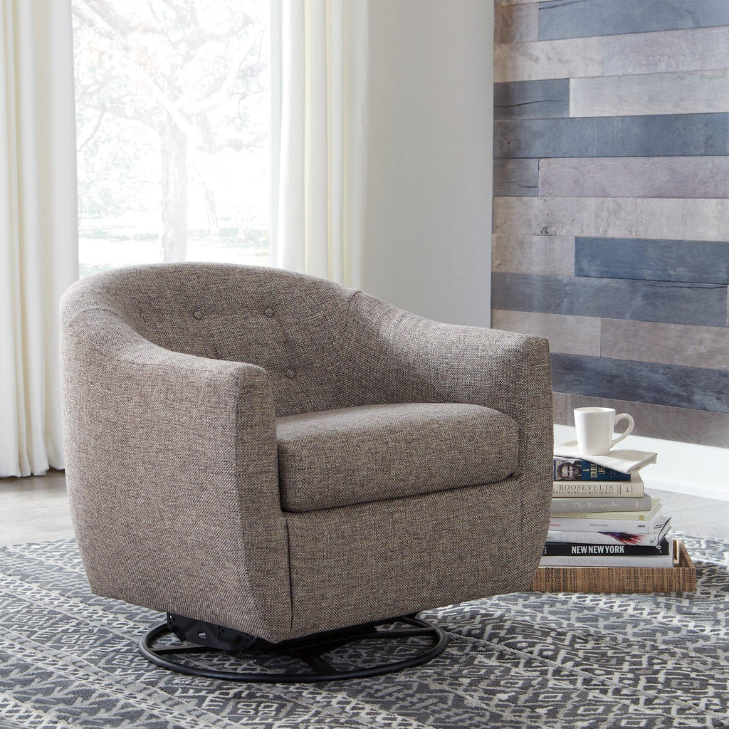 Take a turn for the better with this upscale swivel glider accent chair. Upholstered in a richly woven taupe fabric, this contemporary beauty with tufted barrel back provides a smooth 360-degree swivel that’s such a nice twist.