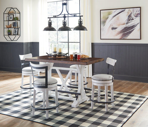 This 5-piece dining set serves up the best in rustic farmhouse living. The counter height table's two-done distressed finish pairs a brown tabletop with a distressed vintage white base, while black metal footrests add a distinctive twist. The bar stool's black metal frame and rustic brown swivel seat offer a contrasting eclectic style.