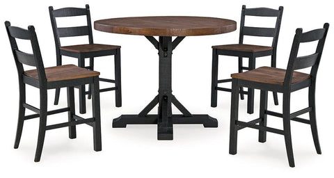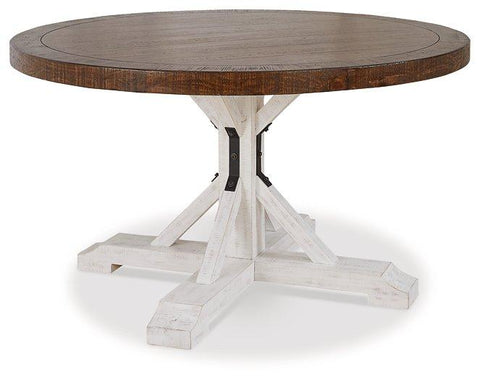 This 5-piece dining set serves up the best in rustic farmhouse living. The extension dining table's two-tone distressed finish pairs a brown tabletop with a vintage white base for a double helping of charm. And the upholstered chair, with timeless ladderback styling and a comfortably cushioned seat, is something to savor.