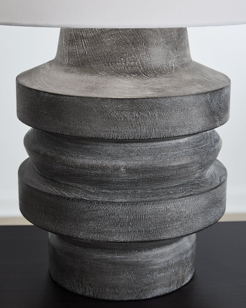 With this table lamp, you'll find an expert balance of modern design and casual function. Its distressed black faux wood finish captures the essence of natural motifs while maintaining a curated sense of character. What an artistic approach to everyday illumination.
