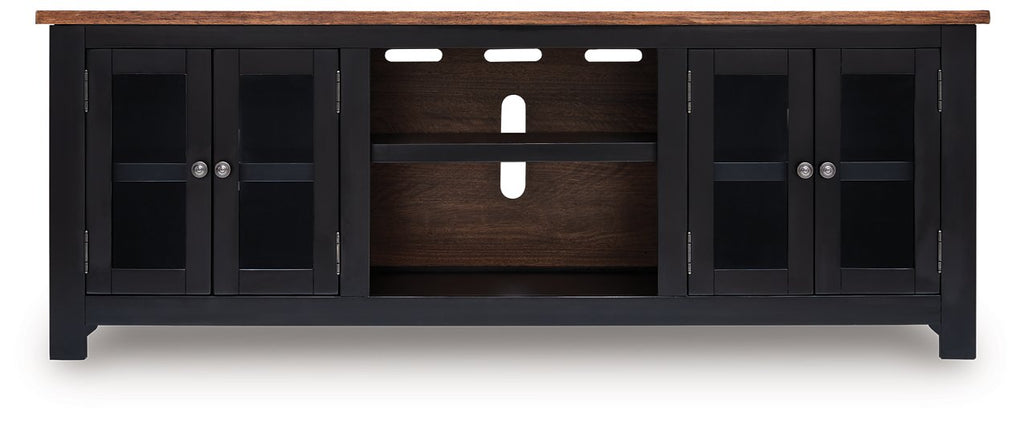 Raise the bar on modern farmhouse style with this TV stand with electric fireplace. Its sturdy silhouette and casual good looks are accentuated with a two-tone finish, which pairs a warm satin black base with a contrasting butcher block veneer top. Glass door cabinets with adjustable shelves offer plenty of storage for media and electronics. Adding that much more show-stopping style, the electric fireplace insert operates with or without heat and includes a six-level temperature setting, a remote control and an overheating control for added safety. It comes with faux glass crystals and natural stones, so you can customize the look of the flame bed.