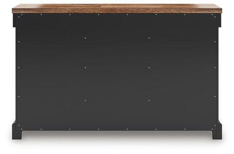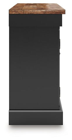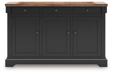 Raise the bar on modern farmhouse style with this dining buffet. Its handsome good looks are accentuated with a two-tone finish and a casual butcher block veneer top. The sturdy silhouette adds a hearty element, whether your style is vintage, country or eclectic. Three drawers and three cabinets with adjustable shelves serve your entertaining needs well.