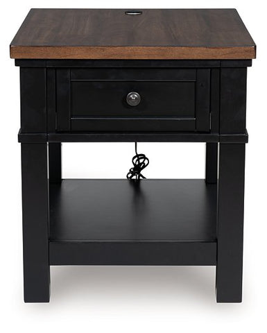 Raise the bar on modern farmhouse style with this end table. Its sturdy silhouette and casual good looks are accentuated with a two-tone finish, which pairs a warm satin black base with a contrasting butcher block veneer top. A spacious storage drawer and dual USB charging ports keep devices powered up and close at hand. Whether your style is vintage, country or eclectic, this table adds a hearty element.