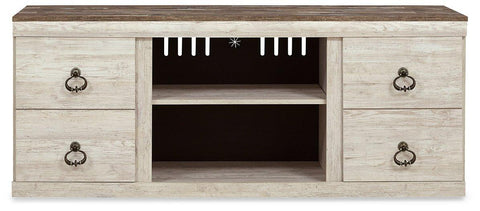 This entertainment center with fireplace option is the ultimate statement piece for your coastal cottage or shabby chic inspired retreat. Whitewashed finish is wonderfully easy on the eyes. Paired with the TV stand’s unique plank-style top, it’s a driftwoody look that has our minds drifting away to beachy-keen escapes. Two tall piers with glass shelving and soft overhead LED lighting allow you to put home accents on display, safely out of the way. This entertainment center is compatible with LED electric fireplace insert (W100-101 or W100-02) or large audio insert (W100-41), which are sold separately.
