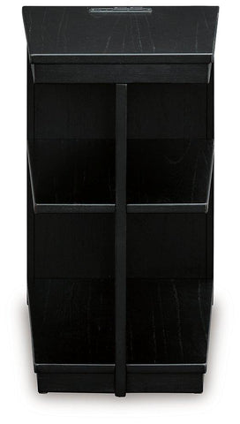 If you are a lover of simplicity, this chairside end table is the perfect choice. Its black finish, casual contemporary design and spacious storage capacity provide functional style wherever it’s displayed. And with conveniently located USB charging ports, this table keeps up with your high-tech lifestyle.