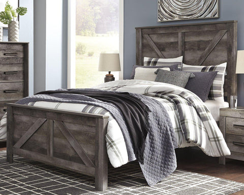 This queen crossbuck panel bed is sure to win your heart with its daring designer take on modern rustic. The bed’s crisp, clean and minimalist-chic profile is enriched with a striking replicated oak grain with thick plank styling and a weathered gray finish for that much more authentic character. Mattress and foundation/box spring available, sold separately.