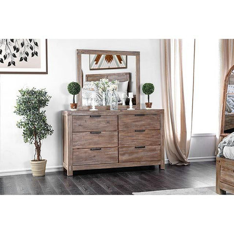 Wynton Weathered Light Oak Dresser, 62"W X 18"D X 38"H, 163.9lbs. Inspired by reclaimed wood designs, this bedroom dresser flaunts its gorgeous wood grain and weathered light oak finish. The dark metal hardware on the six drawers blend into the simplified construction, for an unfettered look. Give your room an ear thy undertone to inspire a brand new bedroom aesthetic. Features: Transitional Weathered Light Oak Solid Wood,Wood Veneer,Others Felt-lined Top Drawers English Dovetail Drawer Construction