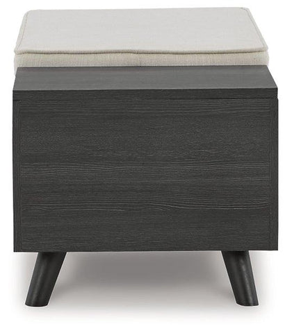 The clean profile of this small storage bench makes an entrance anywhere and everywhere you place it. Replicated blackened wood finish with a grayed textural grain and tapered wood legs lend a fresh flair. Adding form and function, both tops are removable to expose hidden storage underneath. A must-have piece for small spaces.