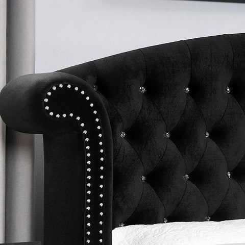 ZOHAR E.King Bed, Black, 88 1/8"L X 98 1/2"W X 56 1/2"H, 198lbs. Showcase your personal taste with this bold statement piece in your bedroom. Fully upholstered in flannelette, this bed features an oversized wingback headboard with eye-catching tufting and lined with nailhead trim. The padded fabric and crystal buttons continue all throughout the bed frame and the matching case goods. Each drawer handle is made of glistening acrylic crystals, while silver-painted cabriole legs are perfect in bringing in majestic vibes that this ensemble set out to do.